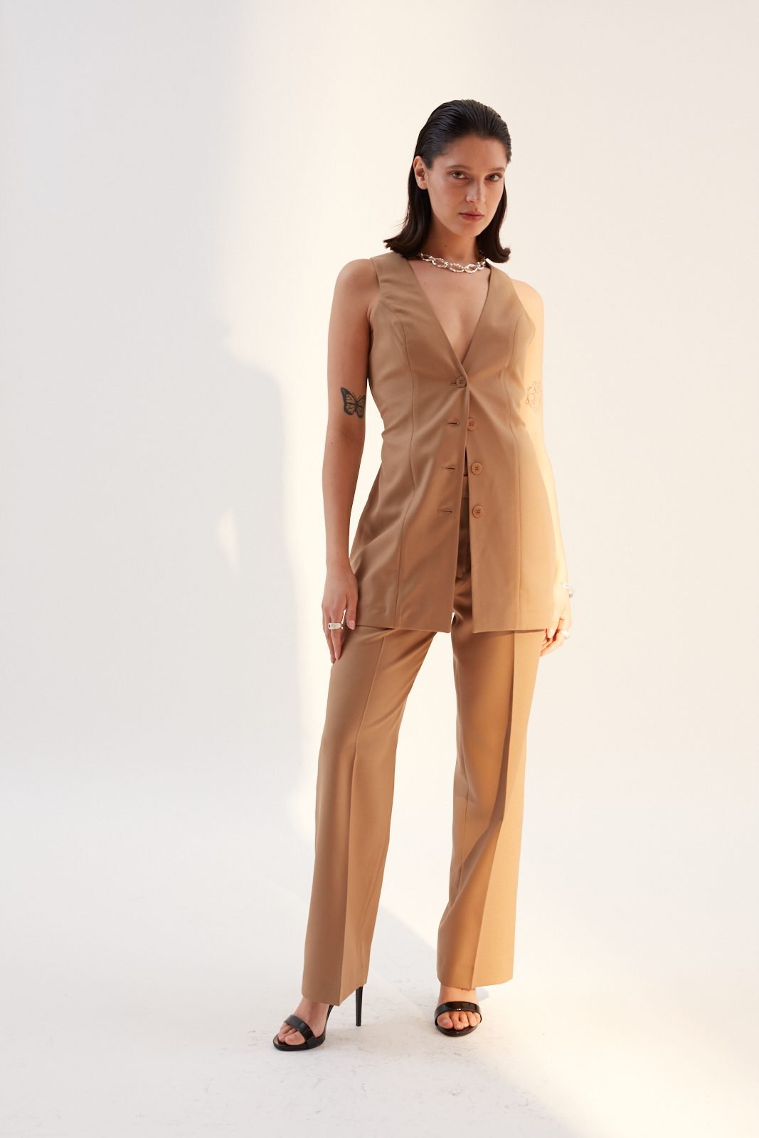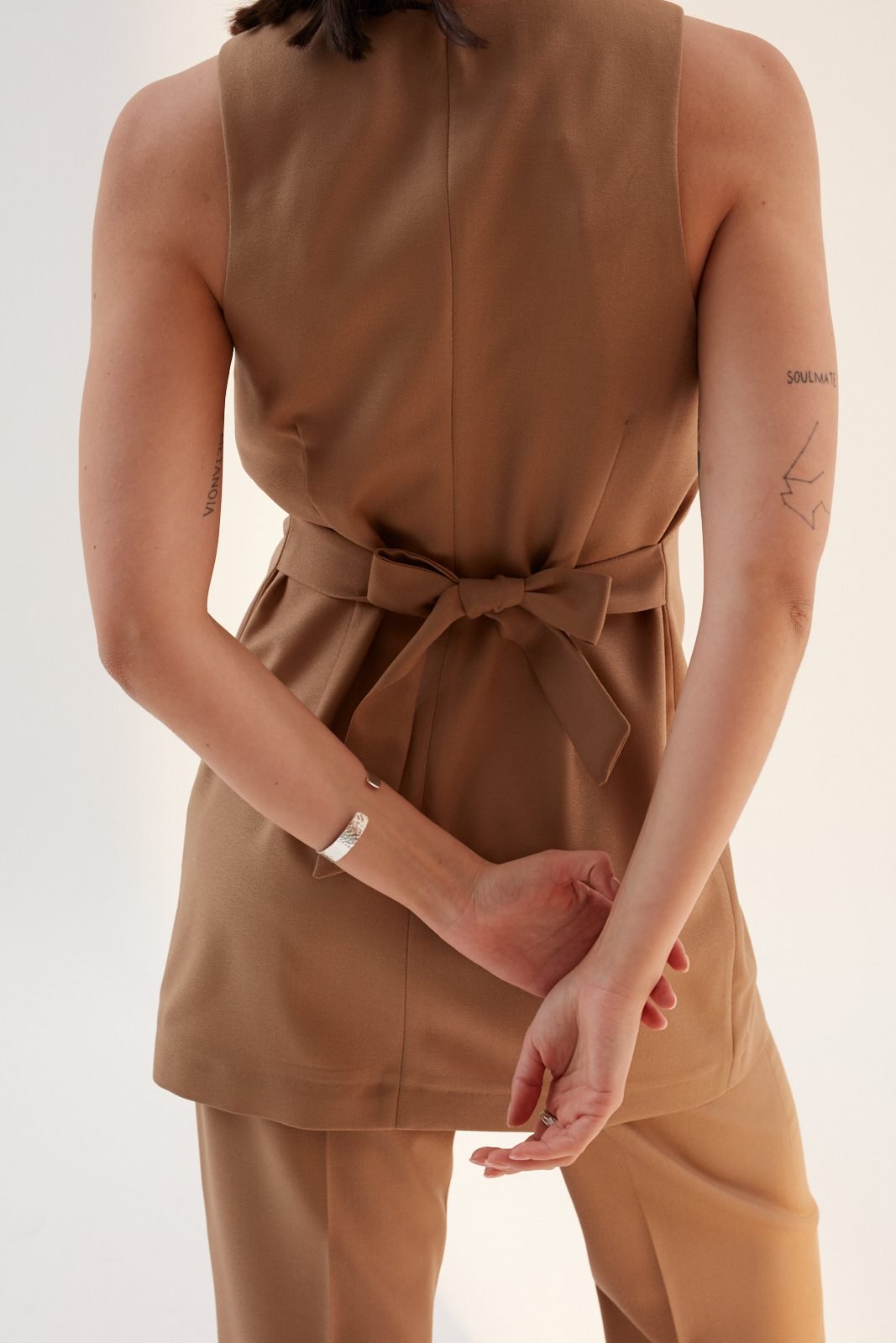 Un ícono de sofisticación que se adapta a cada instante. Este vest, diseñado en un tono camel atemporal y marengo, es la pieza que transforma cualquier look con elegancia natural.