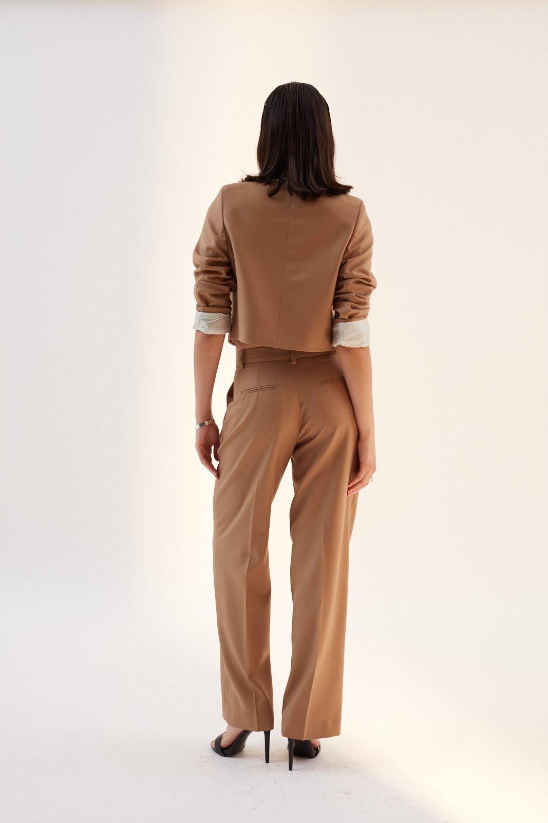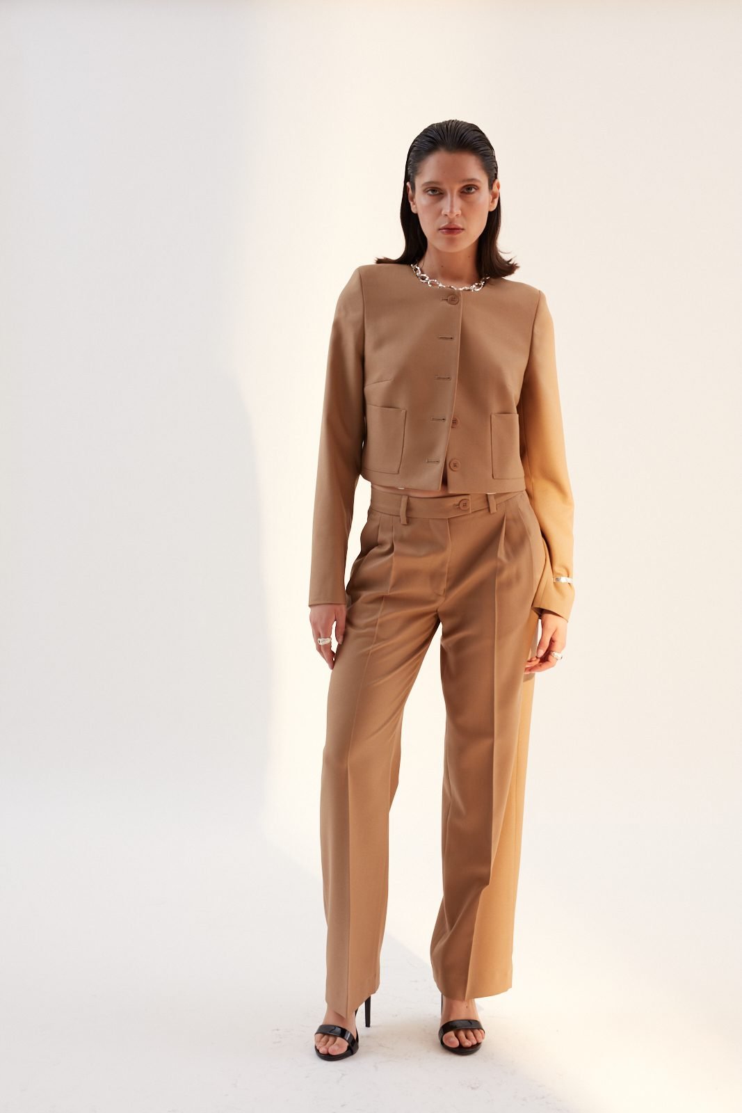 La elegancia se reinventa en líneas puras y proporciones exactas. Esta chaqueta en tono Camel y Marengo, de corte recto y minimalista, es un tributo a la sofisticación sin esfuerzo.