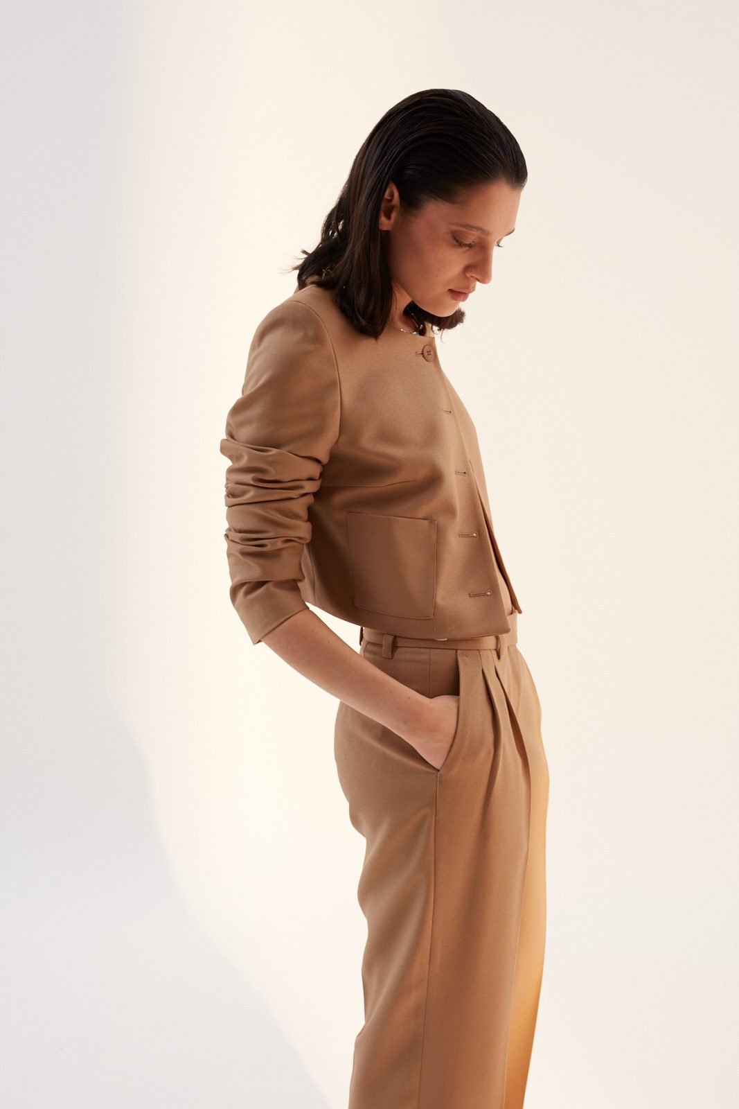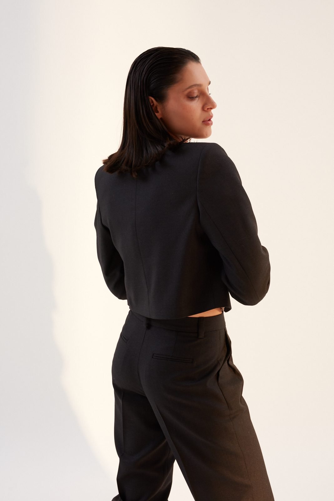 Sus botones joya aportan un destello sutil, mientras que su silueta cropped resalta la cintura con delicadeza y sus hombreras permiten resaltar tu poder. Versátil y atemporal, acompaña tanto un look urbano de día como una propuesta nocturna llena de carácter.